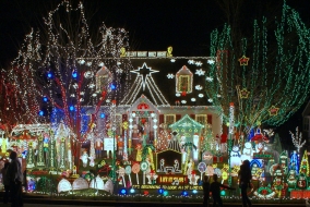 with little time for decorating. Guess who won that debate… lights were put on the bushes. From those first few lights we have grown to our current display. Slowly at first with a single reindeer added in 2000, a second reindeer and 2 spiral green trees in 2001. A few more decorations were added over the next couple years until 2004 when we had a major increase to 93,000 lights.